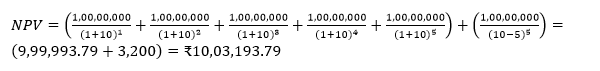Let us assume that a company is trying to find its valuation based on its cash flow over a period of 5 years. It estimates that it will generate a free cash flow of ₹1 crore every year, and its WACC is 10%. After that, the company believes that it will continue to grow at 5%. Therefore,