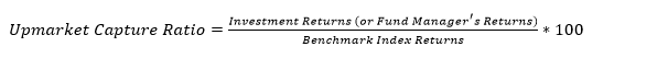 As the name suggests, the Up-market Capture Ratio represents the investment performance in a bullish market. It is calculated as a percentage for a 1, 3, 5, 10, and 15-year period. When the Up-market Capture Ratio is more than 100, it means that the investment has outperformed its benchmark and vice versa for below 100. For instance, if the Up-market Capture Ratio of an investment is 115, it means that the investment outperformed the benchmark index by 15%.