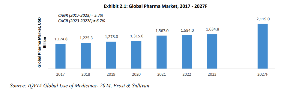 - Resilient and sustainable long-term growth has been evident in the pharma segment : The pharmaceutical market is pivotal in advancing global healthcare, encompassing critical aspects such as research, development, manufacturing, and distribution of pharmaceutical products, including drugs, vaccines, and biotechnology-based therapies. Valued at USD 1,634.8 billion in 2023, the market is projected to reach USD 2,119.0 billion by 2027, with a CAGR of 6.7% from 2023 to 2027