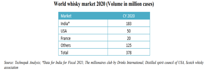 - UAE imports approximately 43% of the total whisky exported by India :  In 2020, India exported approximately 6.12 million cases of whisky to other countries in the world. United Arab Emirates (UAE) was the largest importer of IMFL whisky importing 23.7 million litres (2.6 million cases) in 2020 accounting for 43% of the total share. (Source: Company DRHP)