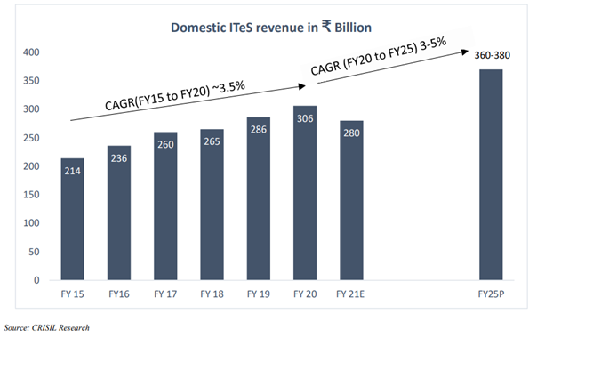 - Review and Outlook of ITeS Industry in India : The Indian IT enabled services (“ITeS”) market was estimated at USD37 billion in the Financial Year 2020, with approximately 90% driven by exports while the remaining 10% was driven by the domestic market. The Indian ITeS market is estimated to have declined marginally by 1-3% in the Financial Year 2021 over the previous year. Over the medium term, the ITeS industry is estimated to grow at a 5-7% CAGR between the Financial Years 2020 to 2025. (Source: Company DRHP)