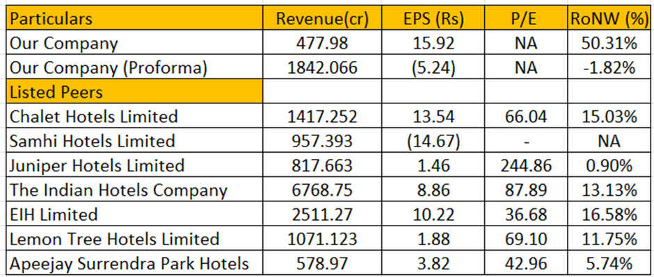 The company has highlighted 7 companies as listed peers - Chalet Hotels, Samhi Hotels, Juniper Hotels, The Indian Hotels Company, EIH, Lemon Trees and Apeejay Surrendra Park Hotels. In this section, we look at the financials of the company(FY24) and see where VHL stands among its peers: