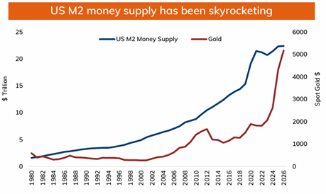 Another important factor is the sharp rise in the United States M2 money supply. M2 is a broad measure of money in circulation and includes cash, demand deposits, small certificates of deposit, savings accounts, and money market funds. The significant expansion of money supply has been a key factor supporting higher asset prices. In this environment, gold continues to be viewed as a store of value and a hedge against inflation.