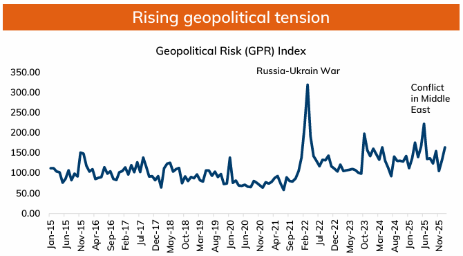 A rise in the Geopolitical Risk index reflects growing global tensions. The index saw a sharp increase in 2022 following Russia’s invasion of Ukraine and has remained elevated since then due to continued tensions in the Middle East. Higher geopolitical risk levels often support demand for gold as investors turn to safe haven assets during periods of uncertainty.
