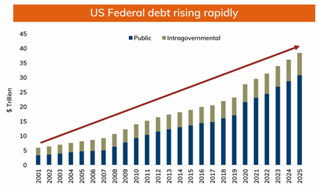 The United States national debt has crossed $38 trillion, with the debt to gross domestic product ratio close to 126%. The United States is paying about $970 billion each year only to service interest on this debt. Investors are concerned that if these payments continue to increase, the funds available for infrastructure, healthcare, and education may decline, which could affect long term economic productivity.