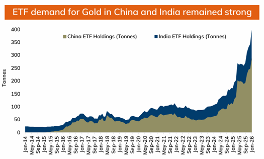 In India, gold ETF holdings also reached a major milestone. Total holdings crossed 100 tonnes for the first time and increased by a record 15.5 tonnes in a single month, reaching 110 tonnes by January 2026.