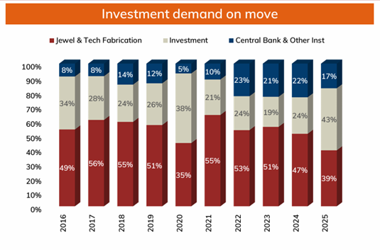 Investment demand for gold has increased sharply. Total investment demand reached 2175 tonnes, surpassing the previous record of 1805 tonnes seen in 2020. This rise was mainly supported by strong inflows into gold ETFs and robust demand for gold bars and coins. ETFs contributed more than 801 tonnes of demand, while bars and coins accounted for about 1374 tonnes.