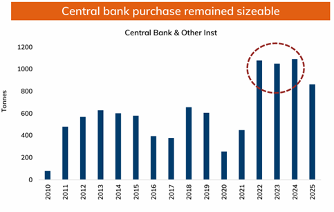Although the pace of central bank purchases slowed slightly, buying activity remained significant. In 2025, central banks purchased about 863 tonnes of gold. Over the past three years, annual purchases have remained above 1000 tonnes. This level is considerably higher than the period from 2010 to 2021, when the average annual purchase by central banks was around 473 tonnes.