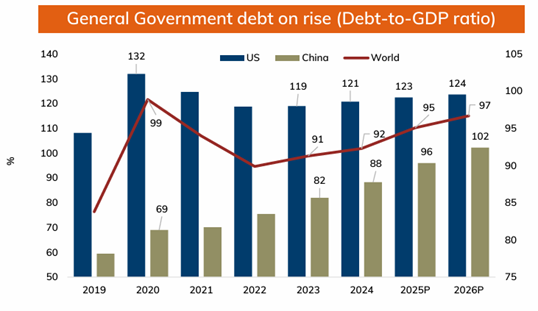 Global debt levels remain elevated and are expected to stay high as fiscal deficits continue to rise. These deficits reflect the costs of Covid 19 related subsidies, social welfare spending, and increasing interest payments on existing debt. Total global debt has increased by nearly $29 trillion and has reached a record level of $348 trillion. Global debt may continue to rise as governments increase borrowing to meet spending requirements.