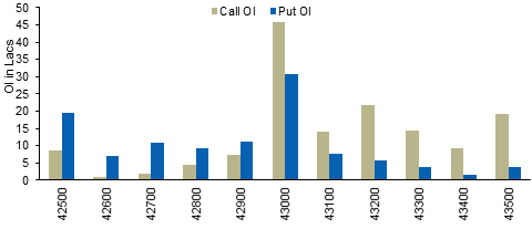 The Bank Nifty is likely to consolidate around current level as both 43000 Call and Put strike witnessed sizeable OI addition. However, our bias continue to remains positive and dip towards 42900 should be used to create long positions.