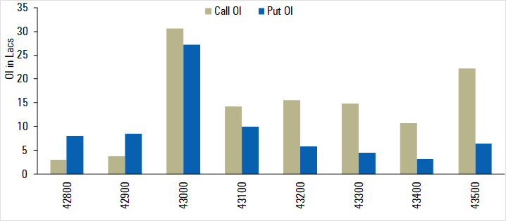 The Bank Nifty is likely to continue its consolidation around 43000 levels. On the options front, ATM 43000 Call and Put hold significant open interest suggesting the same. We expect PSU banks to outperform the private banks