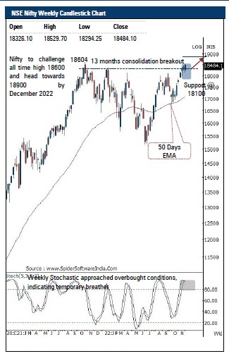 Going ahead, we reiterate our constructive stance of Nifty challenging all-time high of 18600 and gradually head towards 18900 by December 2022. The index has resolved out of past two weeks trading range 18400-18100 underpinned by across sector participation, indicating rejuvenation of upward momentum. In the process, we expect broader market to witness catch up activity against benchmark. Thus, dips should be capitalised on as an incremental buying opportunity. Our positive stance is corroborated with following observations