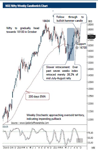 The Nifty started the truncated week on a negative note. However, supportive efforts from 200 days EMA helped index to recoup intra-week losses entirely and settle the week above 17300 mark. The weekly price action formed a bull candle carrying higher high-low, indicating follow through strength to last week’s bullish hammer candle.