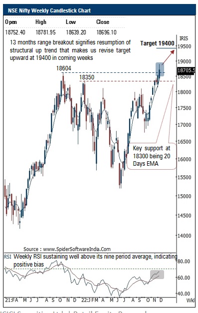 The breakout from 13 months range supported by across sector participation signifies resumption of structural up trend that makes us reiterate our constructive stance and expect Nifty to gradually head towards 19400 in coming weeks. However, the move towards 19400 would be in a non linear manner as bouts of volatility amid global development can not be ruled out wherein we expect broader market to relatively outperform as it is resolving out of three months higher base formation. Thus, dips should be capitalised on as incremental buying opportunity as we expect any temporary breather to get anchored around key support of 18300. The aforementioned positive stance is further validated by following observations: a) Market breadth measured in terms of percentage of stocks above 200dma surpassed 65% for first time in 11 months indicating broader participation b) Dow Jones Industrial retraced last falling segments high in faster time as 9 week decline was retraced in 6 weeks, first time since January 2022 highs c) Dollar Index and US 10Y yields continue to form lower high-lows after breaking from rising channels indicating further downsides. Both have inverse correlation with equities d) India VIX made lowest monthly close since August 2021 with lower high-low indicating lower risk perception by market participant