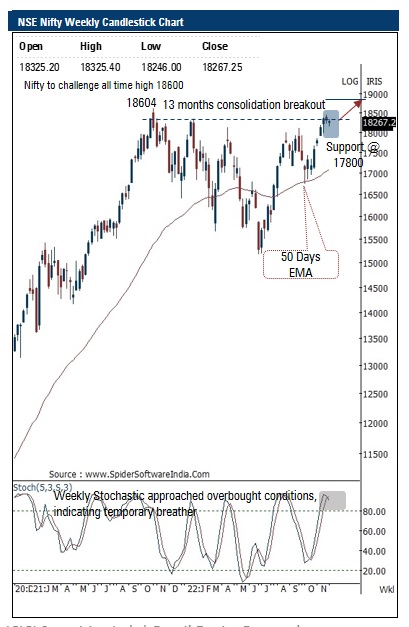We believe, prolonged consolidation in the narrow range of 18400- 18100 would help index to cool off the overbought conditions and eventually pave the way to challenge lifetime highs of 18600 in coming weeks as the broader bullish structure remains intact. In the process, we expect broader market to witness rejuvenation of upward momentum which will help midcap and small cap indices to witness catch up activity against benchmark. Thus, an extended breather should be capitalised on as an incremental buying opportunity as we do not expect Nifty to breach key support of 17800. Our positive stance is further validated by following observations
