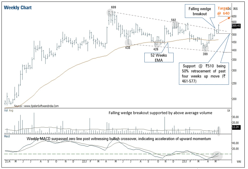 We expect the stock to accelerate upward momentum and gradually head towards ₹ 640 in coming months as it is 80% retracement of CY22-23 decline (₹ 699-399)