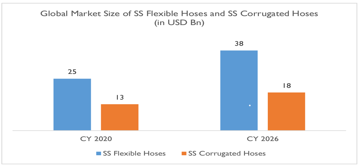 Globally, the market for SS flexible hose was estimated to value at approximately $25 billion in 2020, with the size of SS corrugated hose estimated at $12.5 billion, which is slated to grow to $38 billion and $18 billion by 2027, registering CAGR of 7.5% and 6.3%, respectively.