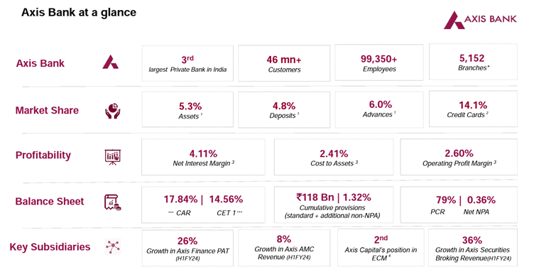 Management Commentary: “In spite of a highly volatile global geopolitical landscape, we believe the India story remains strong. With the upcoming festivities, we are already seeing a surge in demand, which augurs well for business. At Axis Bank, our GPS agenda is on track and we are looking at steady growth for all major business verticals of the Bank. We have been diligently working on both physical reach and digital prowess, extending our services not just to the metros and urban centers, but to the heart of Bharat which is home to the vast majority of India’s population.” Amitabh Chaudhry, MD and CEO.