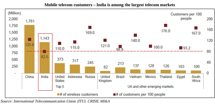 China is the largest telecom market, with 1,781 million wireless customers as of 2022. India follows with 1,143 million wireless customers as of 2022. India has emerged as one of the five fastest-growing wireless telecom markets, with its customer base clocking a 2.9% CAGR between 2013 and 2022.