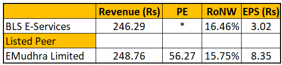 The company has only one listed peer - EMudhra Limited. Let us compare the two on FY23 financials to give you an idea of where BEL stands. Here is the comparison: