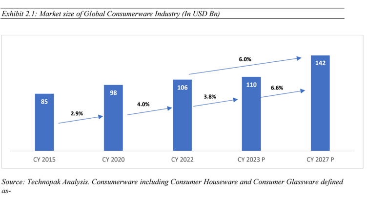 The consumerware market is broadly divided into two categories, consumer houseware and consumer glassware CWL is a prominent player in the consumer ware market in India with a presence in consumer houseware, writing instruments and stationery, andlded furniture and allied products, and consumer glassware categories.