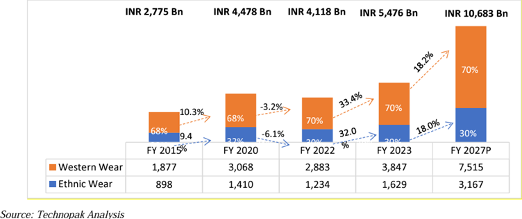 As per the Technopak Report, the share of the organized market for men’s apparel is expected to increase from ~ 45% in FY22 to reach ~60% by FY27. Further, the men’s western wear market contributes to nearly 94% of the total Indian men’s apparel market, and the rest ~6% of the market is contributed by Indian men’s ethnic wear.