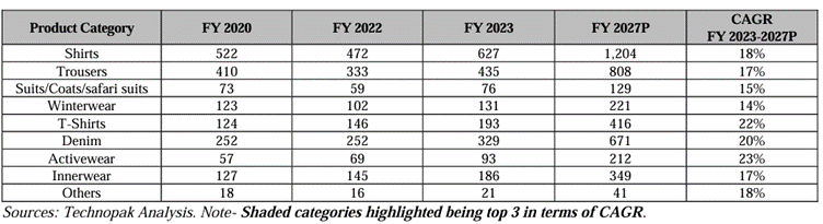 Also, for time pressed consumers today, casual western wear is easy to maintain and wear, and thus becomes a more preferred lifestyle choice. As a result, categories such as denim, activewear, casual shirts, athleisure, and loungewear are growing at a CAGR greater than 20%. Further, casual-led men’s western wear is likely to outpace the growth of formal-led men’s western wear, growing at an expected CAGR of 22% vis-à-vis 18% for the latter from FY22 to FY27.