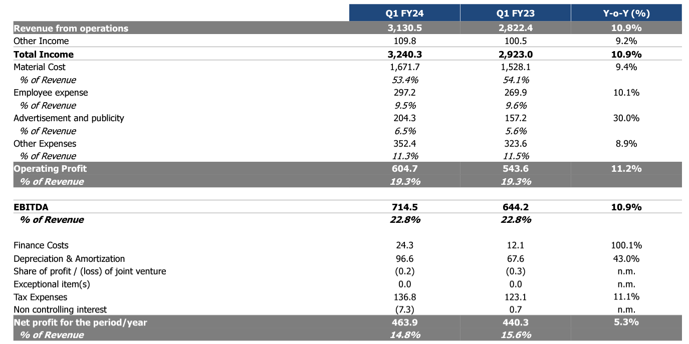 EBITDA: The EBITDA for Q1FY24 was Rs 714.5 crore, a growth of 10.9% over last year's EBITDA of Rs 644.2 crore. EBITDA as of percentage of revenue has remained constant at 22.8%.