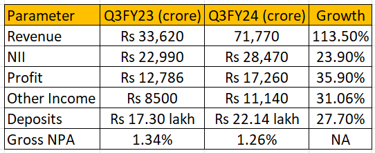 Revenue: HDFC Bank reported net revenue of Rs 71,770 crore for Q3FY24, a growth of 113.5%. In the year-ago period, the bank reported a net revenue of Rs 33,620 crore. In the previous quarter, the net revenue reported was Rs 66,317 crore, an excellent growth of 8.22%.