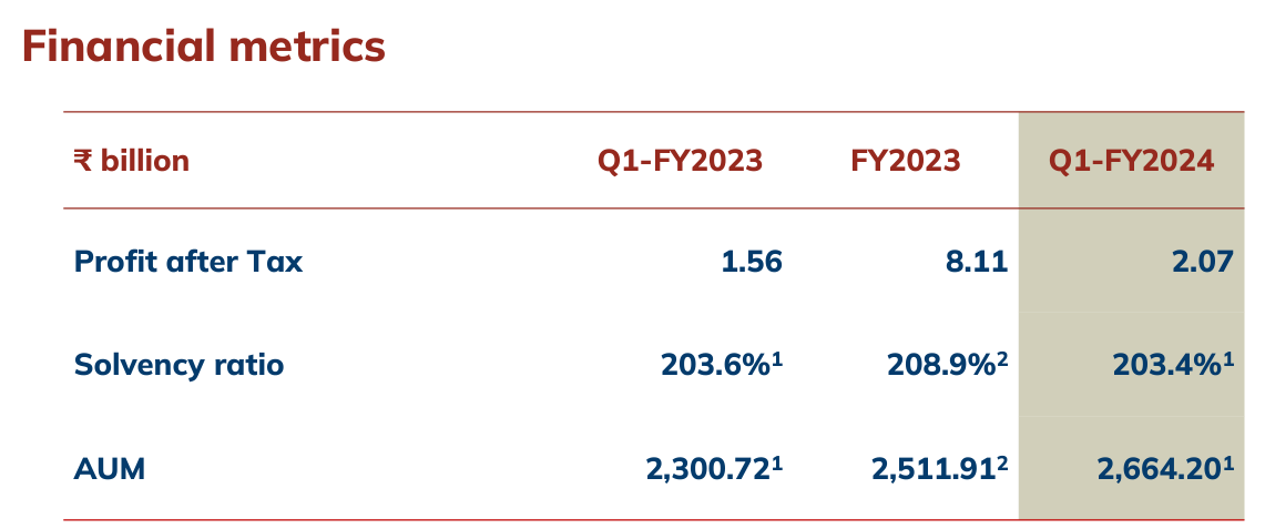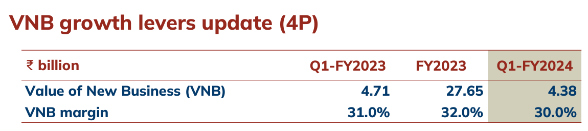 Value of New Business (VNB): It represents the present value of expected future profits from new insurance policies written during a specific period. The Value of New Business (VNB) was at Rs 438 crore for Q1FY24. In Q1FY23, the VNB reported by the company was Rs 471 crore. The VNB has come down as the VNB margins have come to 30% in Q1FY24 from 31% in the year-ago period.