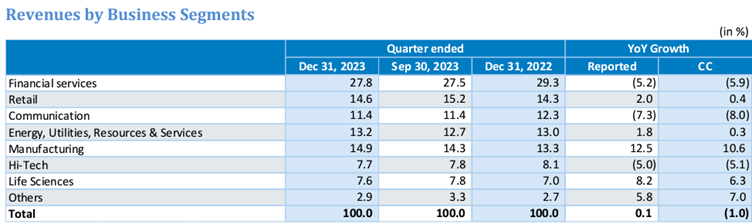 Financial Services segments reported the highest revenue contribution at 27.8%, followed by Manufacturing. Revenue from manufacturing increased by 12.5%, followed by Life Science at 8.2% YoY growth. Communication, Financial Services, and Hi-Tech reported a decline in YoY growth.