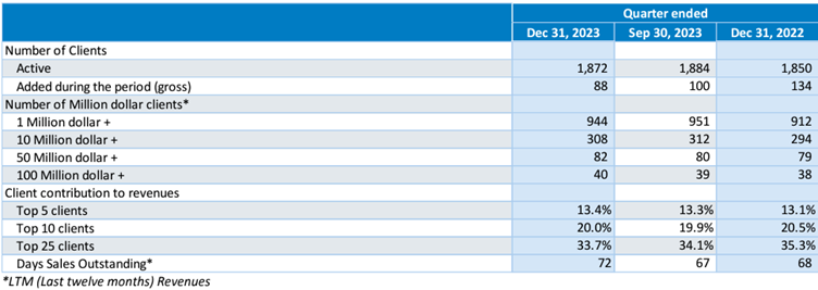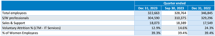 Active Clients: The total number of clients reported by the company for Q3FY24 was 1872, a fall from 1,884 in the September 2023 quarter and an increase from 1,850 in the year-ago period. The number of 100 million dollar+ clients has increased by a count of 1 sequentially and stood at 40. Clients in the 50 million dollar+ increased by a count of two to 82 from 78 in the previous quarter and 79 in the year-ago period.