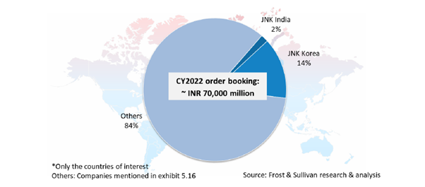 JNK Global has installed its process-fired heaters for its customers in Lagos, Nigeria, where one of the biggest refineries in the world (Dangote Refinery) is operated, having a capacity of 32.7 MMTPA. JNK Global is engaged in the design, manufacturing, installation, and maintenance of Fired Heaters and ranks amongst the top three industrial use-fired heater producers globally. The company distributes its products within the domestic market and to overseas markets. Based on the order booking in calendar year 2022, JNK India and JNK Global have 2% and 14% market share globally.