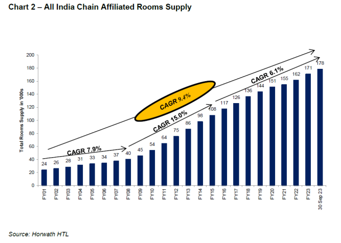 Supply growth has picked up pace, buoyed by the strong demand conditions, with about 7,600 new rooms added between April 2023 and September 2023. The overall CAGR of 9.4% over a period of 22.5 years reflects material supply addition, although of a small supply base as of FY21.