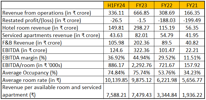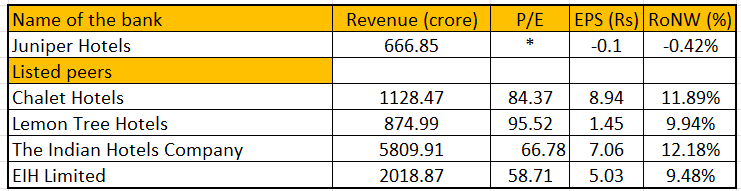 The company has quite a few listed peers - Chalet Hotels, Lemon Tree Hotels, The Indian Hotels Company, and EIH Limited. Let us compare their FY23 financials to see where Juniper stands among its peers: