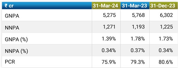 Advances and Deposits: The Deposits reported by the bank for the quarter ending March were at Rs 4.49 lakh crore, increased from Rs 3.63 lakh crore from the year-ago period and Rs 4.09 lakh crore in Q3FY24. Net Advances have increased YoY by 17.6% to Rs 3.76 lakh crore and 5.1% sequentially. CASA ratio stood at 45.5%, down from 52.8% in Q4FY23, and 47.7% in Q3FY24.
