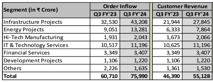 Infrastructure Projects Segment: The Infrastructure Projects segment secured an order inflow of Rs 43,208 crore, during the quarter that ended December 31, 2023, registering a healthy growth of 33% y-o-y basis with receipt of marquee orders mainly in the Power Transmission and Distribution business. International orders at Rs 27,230 crore constituted 63% of the total order inflow of the segment during the quarter. The segment posted customer revenues of Rs 27,845 crore, registered a y-o-y growth of 27%