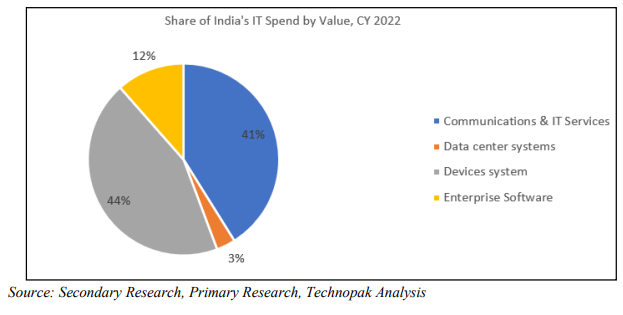 India’s IT spending includes IT spending on products (hardware, software) and services. In 2022, all subsegments within IT spending have depicted growth, however, devices, enterprise software, and IT services have grown the fastest in the last two years owing to the positive impact of the pandemic on the technology industry. IT spending is projected to reach a value of Rs 10,870 billion by 2025 growing at a CAGR of 10%.