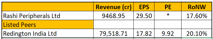 The company has only one listed peer - Redington India. Let us compare the FY23 financials to give you an idea of their business: