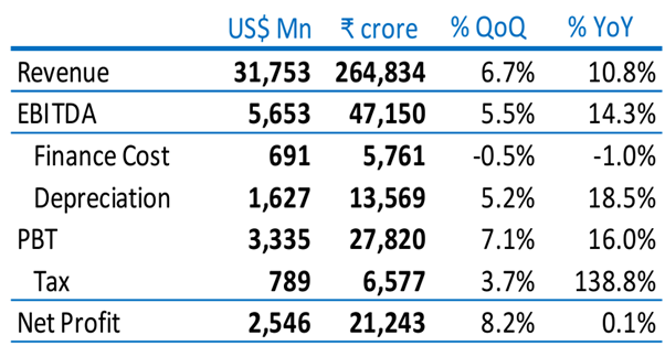 Revenue: The consolidated revenue reported by the company for the quarter ended March was Rs 2,64,834 crore. The revenue reported was up 10.8% YoY and 6.7% sequentially. The YoY revenue growth was led by low double-digit growth in consumer and O2C business