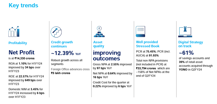 Deposits: CASA deposits stood at Rs 18.86 lakh crore for the second quarter of the current financial year, a 4.34% growth from the year-ago period. The Current Account (CA) deposits have increased by 8.77% to Rs 2.53 lakh crore, while the Saving Account (SA) deposits increased by 4.34% to Rs 16.33 crore.