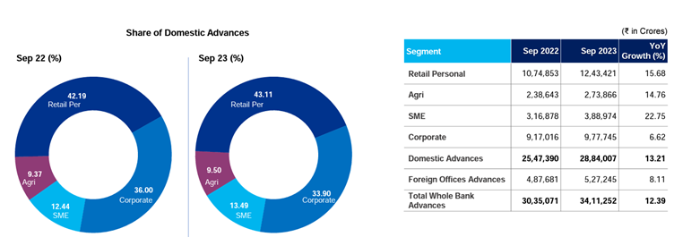 Advances: The total gross bank advances increased to Rs 34.11 lakh crore in the September quarter, up 12.39%. In the year-ago period, the total advances were Rs 30.51 lakh crore. The maximum growth was seen in the SME segment, with a total growth in advances of 22.75%. Domestic advances stood at Rs 28.84 lakh crore, a growth of 13.21% YoY.