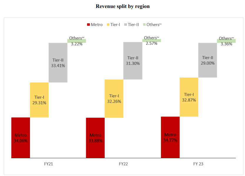 The domestic gems and jewelry market was rough ~Rs 4,700 billion in FY23 with gold jewelry dominating the overall market with a 66% share. Domestic jewelry demand has historically been dominated by consumption. The share of gold jewelry came down from around 75% in FY22 to 66% in FY23. Though, jewelry demand continued to dominate overall gold consumption in India.