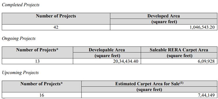 Since incorporation, they have completed 42 projects in the South-Central Mumbai region. In addition to the completed projects, they have 13 ongoing projects and 16 upcoming projects as of October 30, 2023. Also, they have Land Reserves of 10,359.77 sq. mtr.