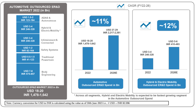 The automotive outsourced ER&D market is pegged at $18-20 billion in 2022 and is expected to grow at a faster rate than overall automotive ER&D spending during 2022-2026. The global share of digital technologies in automotive ER&D spend is expected to grow at a CAGR of approximately 16% from 2022 to 2026, increasing from 26% of total spend to 36% in the same period.