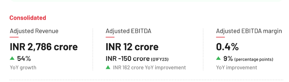 Revenue: The company reported a consolidated adjusted revenue of Rs 2,786 crore, up 54% YoY as demand growth recovered on cooling inflation and the strength of the food delivery platform’s loyalty program.