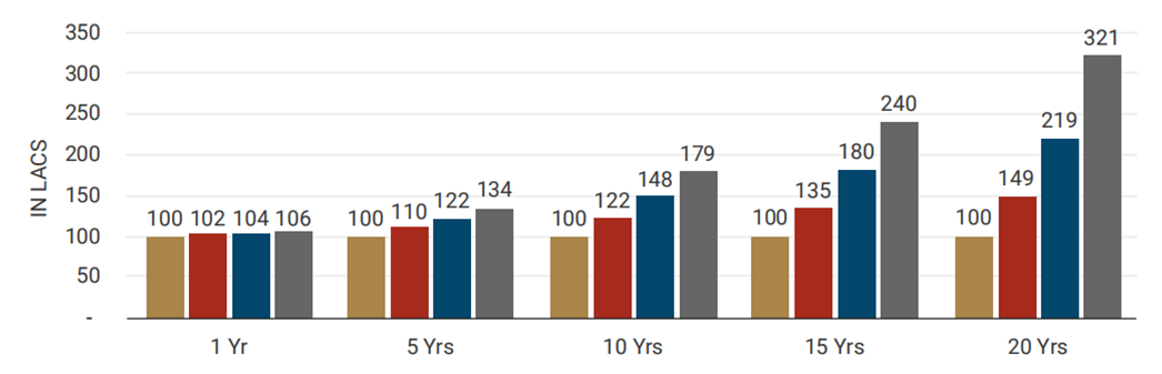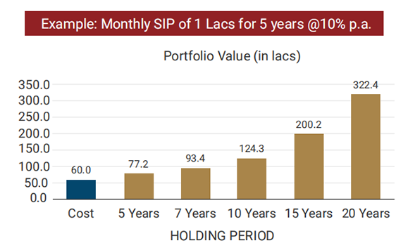 If you invest Rs. 1 lac per month for a period of 5 years and then stay put for next 15 years (at end of 20th year), you would arrive at a portfolio value of Rs. 3.22 cr assuming a 10% return per year.